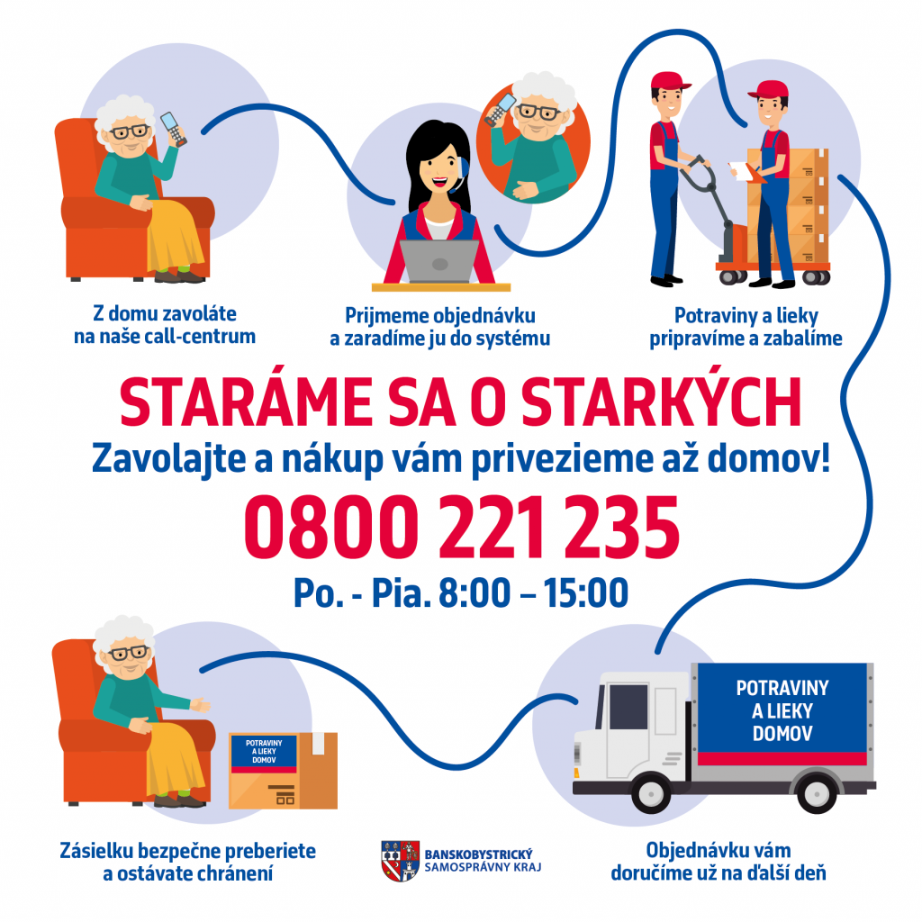 Nákup potravín seniorom a osamelým privezie Banskobystrický samosprávny kraj až domov. Volajte zadarmo na 0800 221 235, pondelok až piatok od 8:00 do 15:00, nadiktujte svoj nákupný zoznam a zaplatíte pri doručení. Seniori a rizikové skupiny ľudí, zostaňte doma a nedajte šancu koronavírusu. Volajte 0800 221 235 a potraviny vám župa privezie až domov.