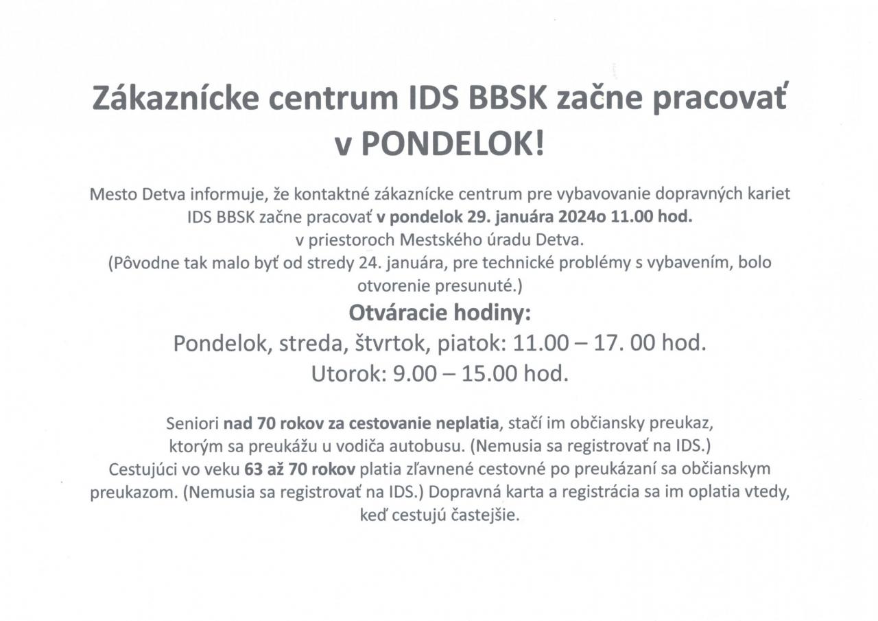 Oznamy - Zákaznícke centrum IDS BBSK začne pracovať od 29.01.2024 na Mestskom úrade v Detve