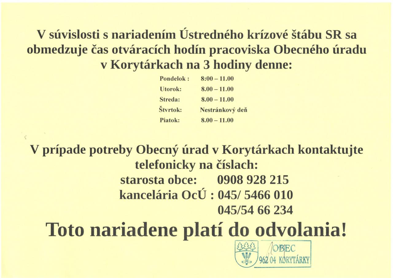 Oznamy - Zmena otváracích hodín Obecného úradu pre verejnosť